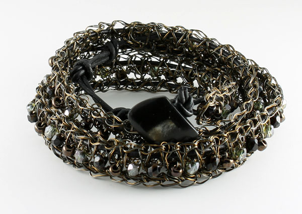 CHV551: Dark antique bronze crocheted wire triple wrap bracelet with vintage black button, fire polished Czech beads and leather cord